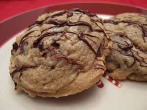 Melt a few squares of Ghirardelli 60% chocolate with a double boiler on medium to medium-high heat. Using a fork, drizzle chocolate over the tops of cookies and then put the cookies in the fridge for 15-20 minutes.