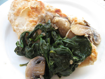 She added some fresh spinach to the pan, and she might have thrown in a little more wine as the spinach wilted. The chicken breasts were placed back in the pan with the lid on to finish cooking. Here is the final product, which was amazing.