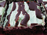 2. Use a hand mixer to cream together 1/4 c. soft butter, 2 T milk, 2 c. powdered sugar, and a dash each of peppermint extract and green food coloring. Spread the frosting over the brownies, and cool in the refrigerator for an hour.