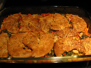 Pour vegetables into a 13″ x 9″ pan, and cover with torn bread slices. Sprinkle with remaining Parmesan cheese and thyme, and bake for 20 minutes at 400F.
