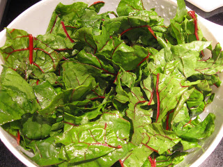 I saw this recipe in Real Simple, but wanted to lighten it up. It ended up being a nice vegetarian summer meal. The recipe calls for a whole bunch of Swiss chard, which may seem like a lot but it does cook down. Here is the Swiss chard, ready to go into the pan: