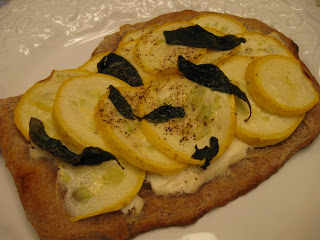 Mix goat cheese, lemon juice, salt, and pepper in a small bowl, and spread on pizza dough. Place zucchini slices on cheese mixture, and top with basil and a dash of black pepper. Bake at 425 for 15 minutes.
