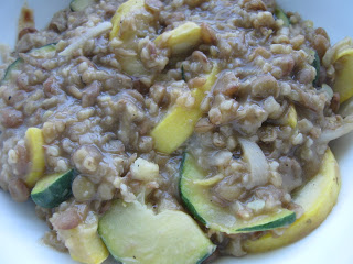 Lentils seem like winter food, but here they are matched with green and yellow squash, which are definitely summer vegetables. This turned out to be a great combination, regardless of the season. I changed the proportions from the original recipe, and switched the spices, but the end result is similar. Think of it as summer comfort food.