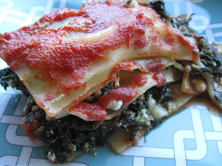 Mix cottage cheese, feta, and spinach in a bowl. Mix in a dash of garlic powder, and black pepper. Spread 1/4 c. sauce in the bottom of loaf pan, and cover with one noodle. Spread 1/4 of cheese mixture on the noodle, and then cover with a few tablespoons of sauce. Continue layering, ending with the fifth noodle, covered with 1/4 c. sauce.