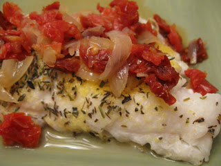 I was originally inspired by this recipe, but was afraid that if I posted the recipe as a seafood dish, those who prefer land creatures would skip right over it. So let’s focus on the best part of this dish: the very chunky sauce. Here it’s shown on a haddock fillet, which was dusted with cornmeal and Italian seasoning, and then baked.