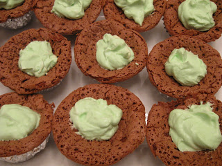 This recipe may look a little complicated, but if you can separate eggs, you can do this. I followed the recipe as instructed, and made an even dozen. Next time though, I’d make a little bit more of the mint cream (to which we added green food coloring for that festive flair.) I would recommend you enlist some help washing the dishes, as you need to clean the beaters three times. Not to mention that you’ll use 3 bowls, 2 pots, and a muffin tin. But it’s worth it, I promise.