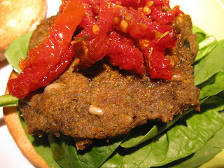 I tried yet another recipe for veggie burgers, but this one from Angela at Oh She Glows was different. First, the texture was much denser than other veggie burgers, which I really liked. But it was also much spicier due to my heavy hand with the cayenne pepper, so I actually have to eat it in sandwich form. It is pictured below garnished with sun dried tomatoes and baby spinach on a Sandwich Thin.