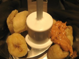 Who remembers the Banana Ice Cream I made last year? It’s not really ice cream, but frozen chunks of banana blended in the food processor. There is a striking resemblance to soft serve ice cream though! One very hot summer night, I was craving ice cream, and remembered that I had stashed an overripe banana in the freezer a few weeks before. I threw it into the food processor, added a spoonful of peanut butter, and in just a few minutes I had a fantastic frozen treat. But don’t linger, this stuff melts quickly!
