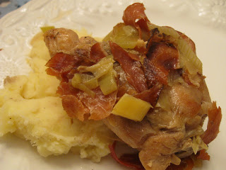 I used 4 oz. of prosciutto and a drizzle of olive oil in place of the bacon lardons, and regular white mushrooms in place of fancier ones, but otherwise followed the recipe as written. It’s a good recipe for a dinner party, because you do a small amount of work up front and then let it simmer on the stove. (You know, so you can race around your kitchen making it presentable for guests!) The minute you lift the lid on the pot, you can smell just how good it’s going to be. The ham, chicken, leeks, and wine all blend together perfectly.
