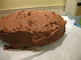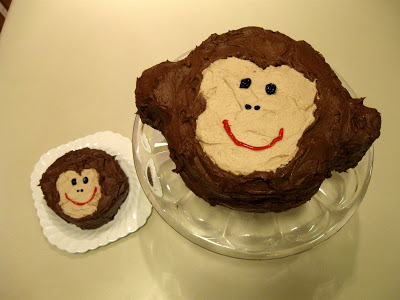 Finally, we filled in the rest of the cake with chocolate frosting, and decorated the monkey faces on both cakes with gel. It was a great moment! We just sat back for a moment with a cup of coffee to admire our work.