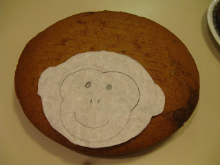 We used wax paper under the first layer, to keep the cake stand clean of course. Instead of using toothpicks, we glued the monkey ears on with frosting. Then we put the lighter colored frosting on the monkey’s face. We had sprinkled powdered sugar around the stencil to serve as a guide.