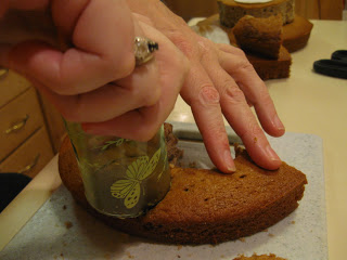 There was a lot of preparation involved. Nancy stenciled some monkey faces on wax paper. Grandma got all the ingredients together, and did the actual baking. Mommy brought over her pretty cake stand. Auntie Kerry got to work with the mixer to put together the frosting, and then Nancy cut out the monkey ears using a juice glass.