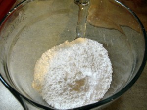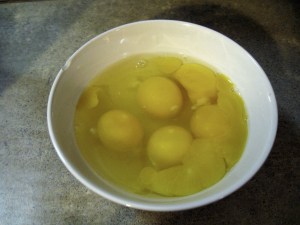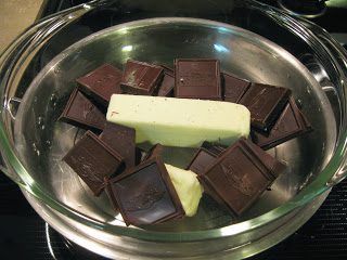 We then moved on to the main course, and by that, I mean dessert. My sister prepared molten lava cakes using this Paula Deen recipe. My request was for something “chocolatey”, and she delivered. All I did was hang out in the kitchen, snapping photos. She started by melting butter and chocolate in a glass bowl set in a pan of hot water.