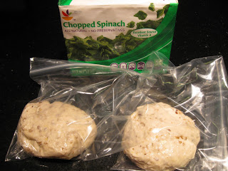 I buy either whole wheat or multi-grain dough, and then separate it into individual portions to freeze. So when it’s going to be a pizza night, I just have to remember to thaw the dough before I leave the house in the morning. This time, I thawed two portions of dough, and a box of spinach.
