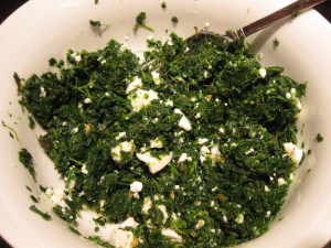 While the dough was resting on the counter under a towel, I squeezed the water out of the spinach, and mixed in a teaspoon of toasted Garlic Gold and a heaping quarter cup of feta cheese.