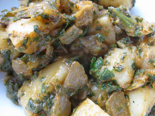 Doesn’t this potato spinach curry look innocent? Well trust me, it’s one spicy dish! I adapted a recipe from Sailu’s Kitchen, which features lots of fabulous looking Indian dishes. And this was a good excuse to head to the Indian market in the town next door to pick up garlic ginger paste and fenugreek leaves. Although the original dish is a curry with more liquid, I left this dry because I wasn’t serving it over rice. That turned out to be a mistake because it was almost too spicy to eat on it’s own. While I liked the idea of a spinach sauce, I prefer the one in Chicken Saagwala. This wasn’t a total failure, but it didn’t quite satisfy my craving for Indian food either….next time.