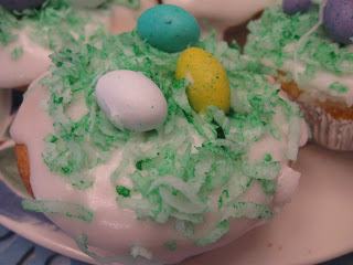 Finally, a truly Easter themed recipe! I originally wanted to make Cake Pops for Easter, but with everything else going on, we decided to move that project out and make these Easter Basket Cupcakes instead. The recipe starts with a fairly basic vanilla cupcake. If you don’t have cake flour, feel free to substitute all purpose flour and cornstarch as suggested here in the Joy of Baking. Then you make a powdered sugar icing, which we chose to leave white. Finally, you add green tinted coconut, and some type of egg shaped candy. We had a cupcake assembly line going so it didn’t take long at all. They came out so cute, and tasted great although the frosting was almost too sweet. But not so sweet that I couldn’t finish the cupcake of course. It was the perfect little treat to end our meal!