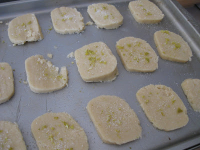 First, we made the cookie dough very early in the morning. We formed the dough into two logs, wrapped them in plastic, and placed them in the refrigerator to chill. The dough was fairly crumbly at first, but firmed up nicely after a few hours. We sliced the logs into circles, garnished them with sugar, salt, and lime zest, and baked the cookies.