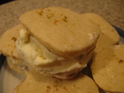 The cookies were really good just out of the oven, a sort of lime shortbread. We could have stopped right there and just had tea and cookies. But with our hearts set on ice cream sandwiches, we pulled out the Cuisinart Ice Cream Maker. It is really easy to make ice cream with the machine. I poured in half and half, lime juice, and more lime zest, and about 20 minutes later we had freshly made lime sherbet. Who needs green food coloring anyway?