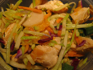 To make dressing, simmer apple juice, ginger, and 2-3 T diced apricots in a small saucepan for 5 minutes. Cool briefly, then pour into food processor and add lime juice, cider vinegar, and maple syrup and blend until smooth.